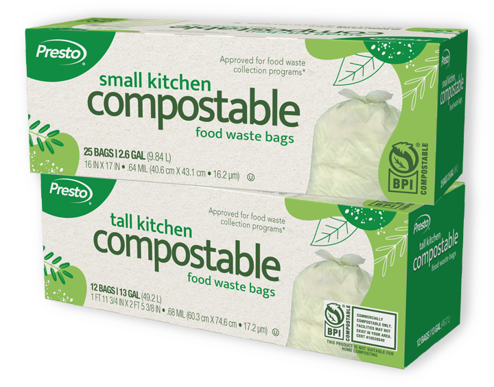 Presto’s line of compostable waste bags meets the ASTM D6400 Standard Specification for compostable plastics. It is specifically engineered to quickly degrade in 10 to 45 days and fully compost in less than 6 months when disposed of in a commercial composting facility. These bags carry the United States Composting Council / Biodegradable Products Institute certification symbol and are ideal for municipal curbside yard waste collection programs.